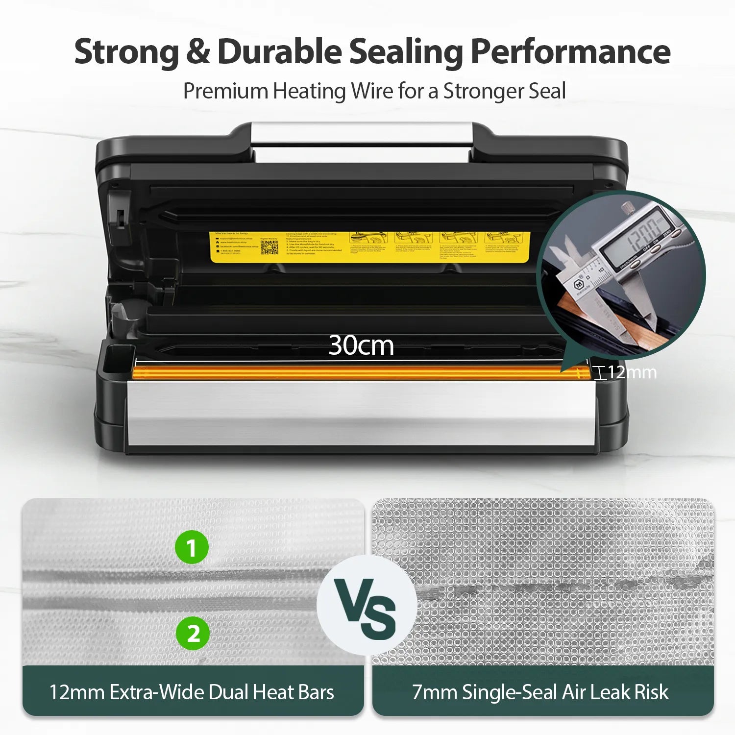 - 【Double Seal for Greater Tightness】Equipped with 30% wider heating strips and 4 layers of heating wires, this vacuum sealer machine can improve the tightness of sealing by double heat sealing and extend the freshness keeping time by up to 8 times.